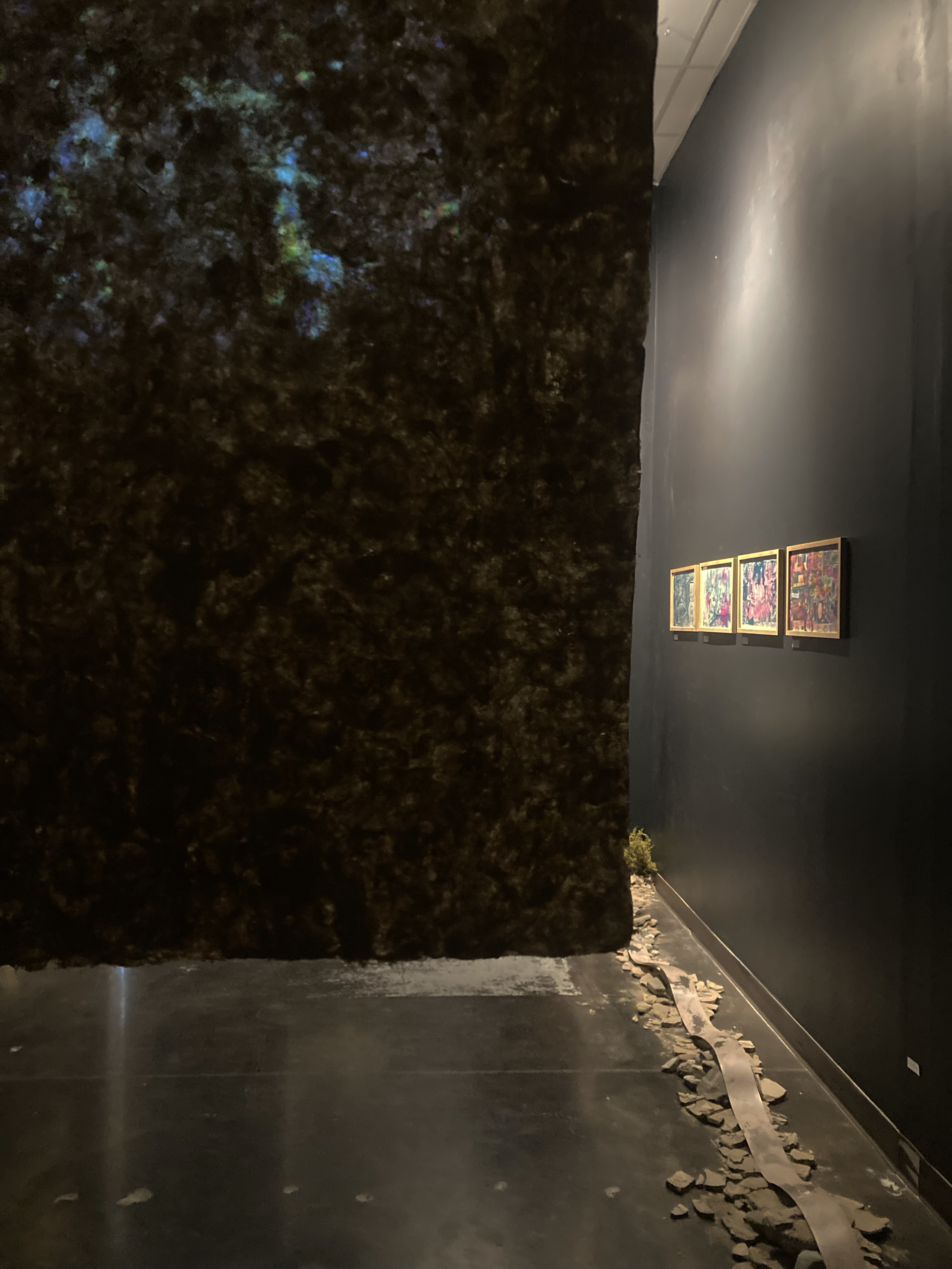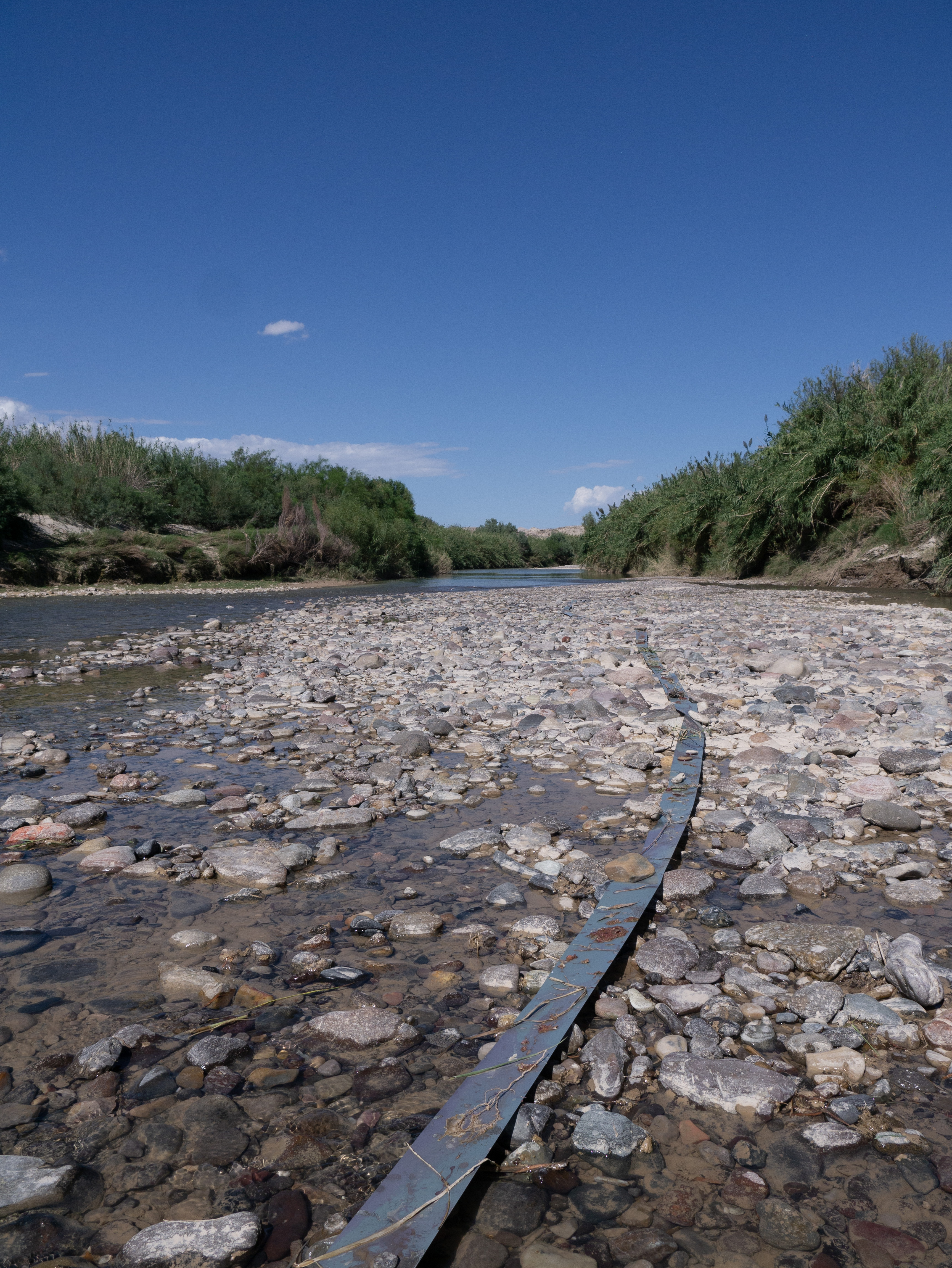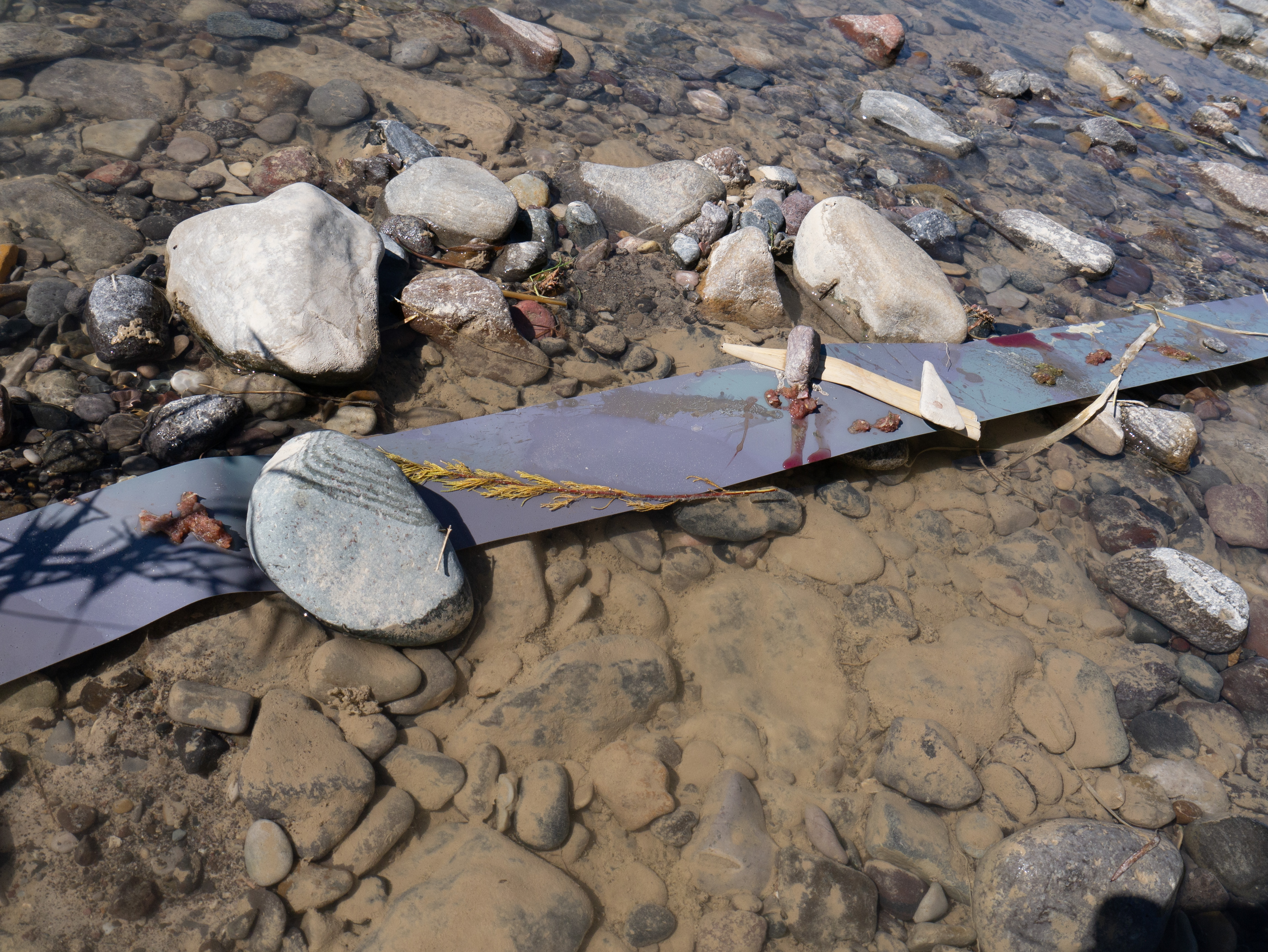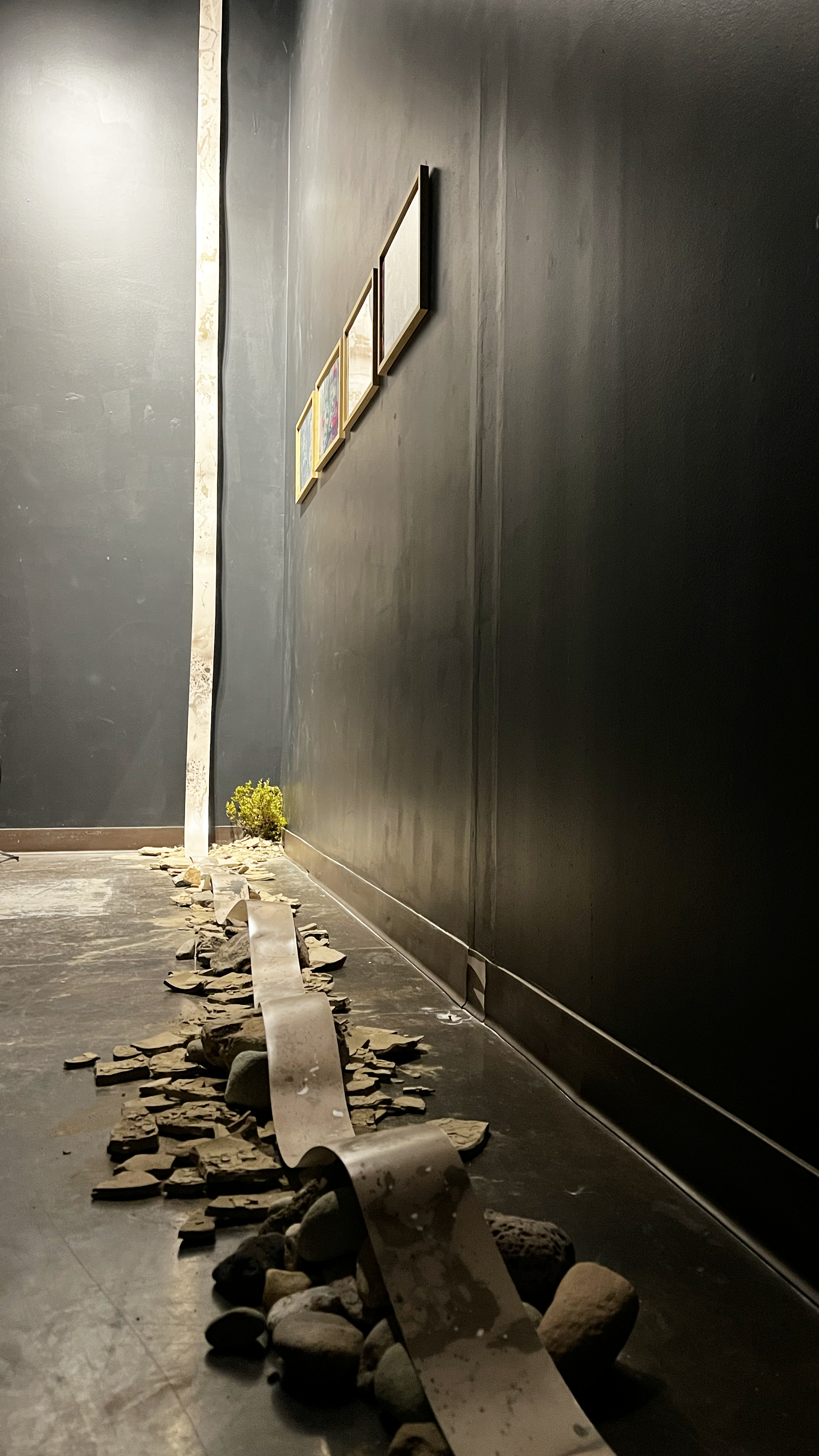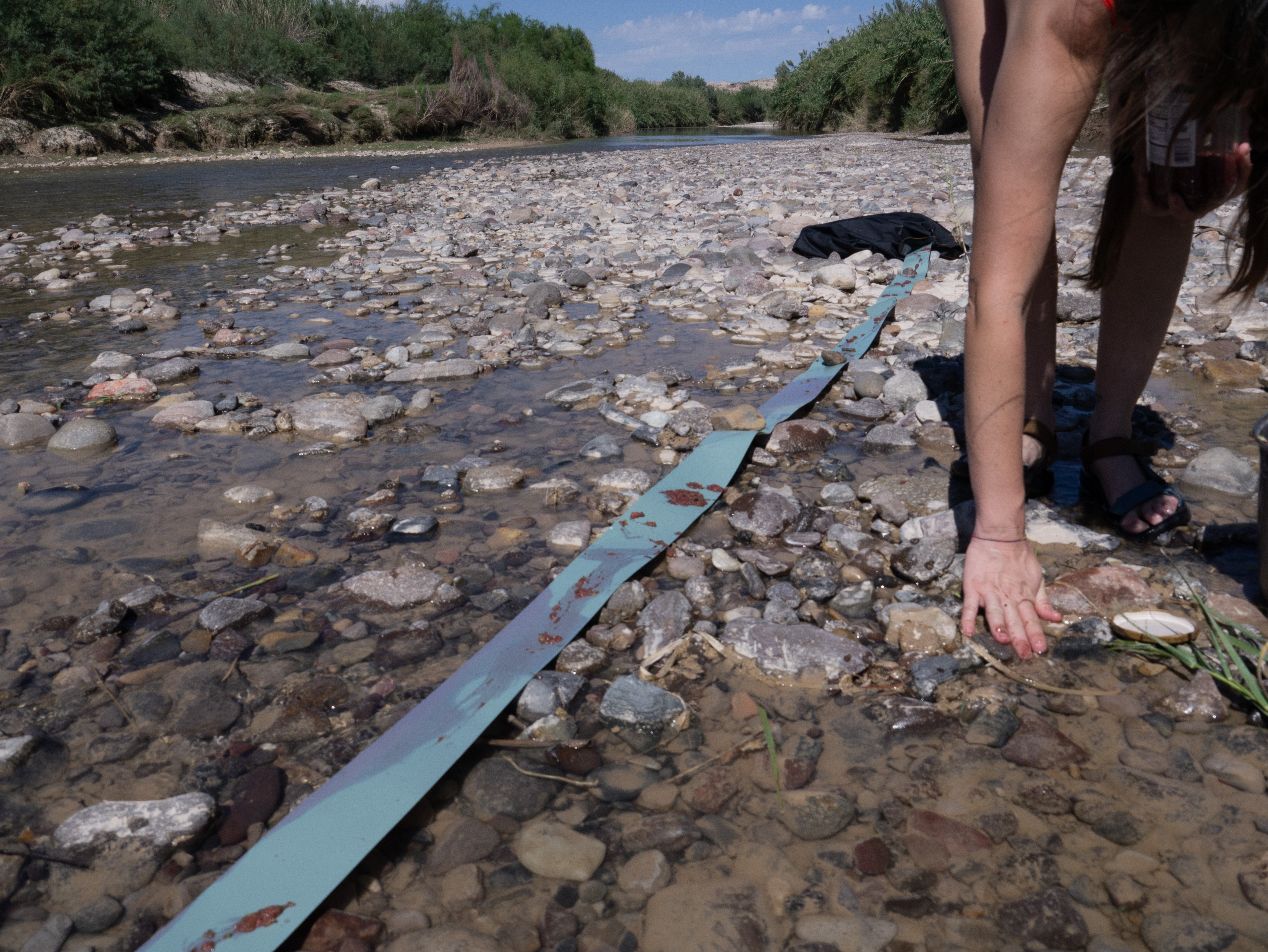 Border Erosion, made in collaboration with Clara Brill and Sam Fullilove, examines the shifting geographies and temporalities of the Rio Grande/Rio Bravo through an intimate survey of the fluidity of light, sound, earth, and water. The site and time-specific works capture the slow moments along a rock island formation in the low summer river that serves as the political boundary between Texas and Mexico. A light-sensitive scroll is laid upon the length of the island on which material earth is then placed, allowing the interaction of the land and the light to make an image of itself with itself. Spanish dagger yucca and giant reed are collected and processed into handmade paper, their fibers intertwining in a soft communion that reclaims their autonomy from colonial associations. Projected on the paper’s surface is documentation of the artists’ collaboration with the river, abstracted and layered, evoking the stratified memories of the landscape and the absurdity of imposing a fixed role on the living and ephemeral. A sonic meditation unfolds featuring tones and timbres of water, animals and insects by its shores, and aural fragments of the creative process shaping the installation’s visual elements. The process-based work, ex-situ in the gallery environment, asks the viewer, what can we learn from a river by defining it not by the territories that it cuts but by the inter-being connections that it fosters?