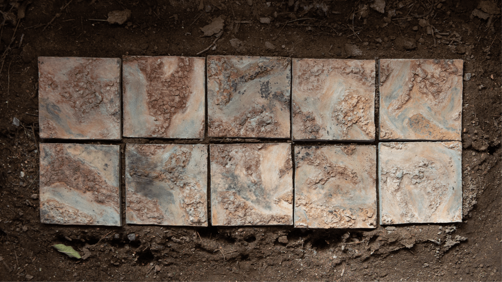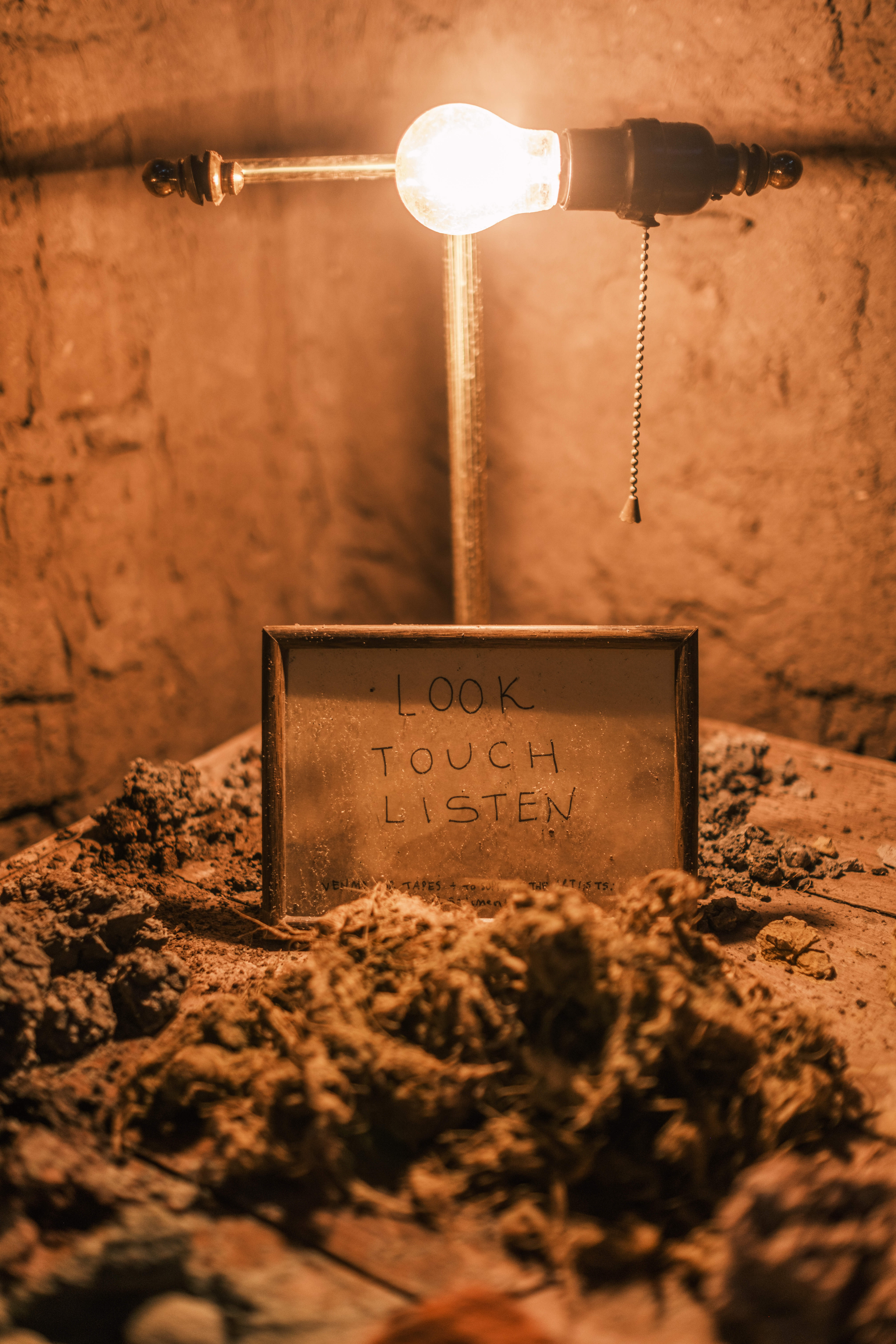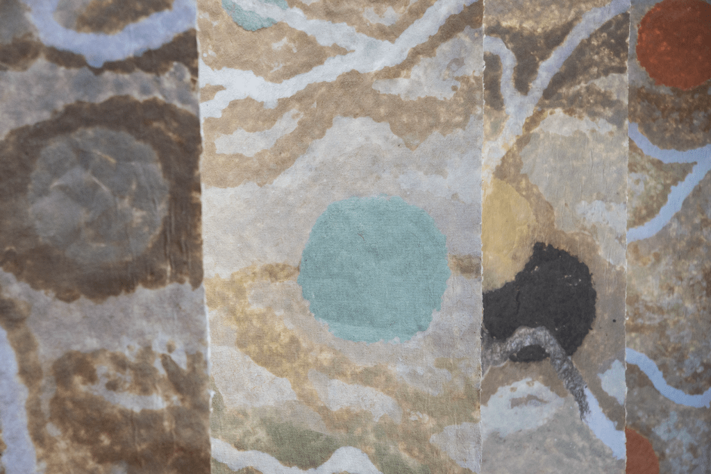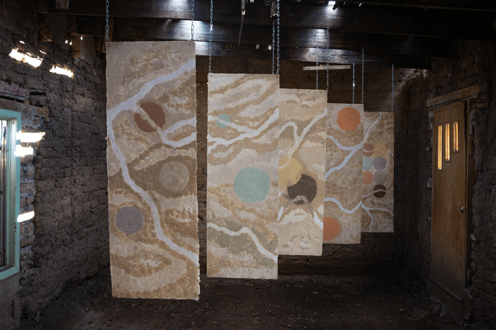 handmade paper panels produced from carrizo (Arundo donax) and soils from the big bend region of the chihuahua desert, ceramic tiles from locally harvested clay and soil, interactive soundbank and material station